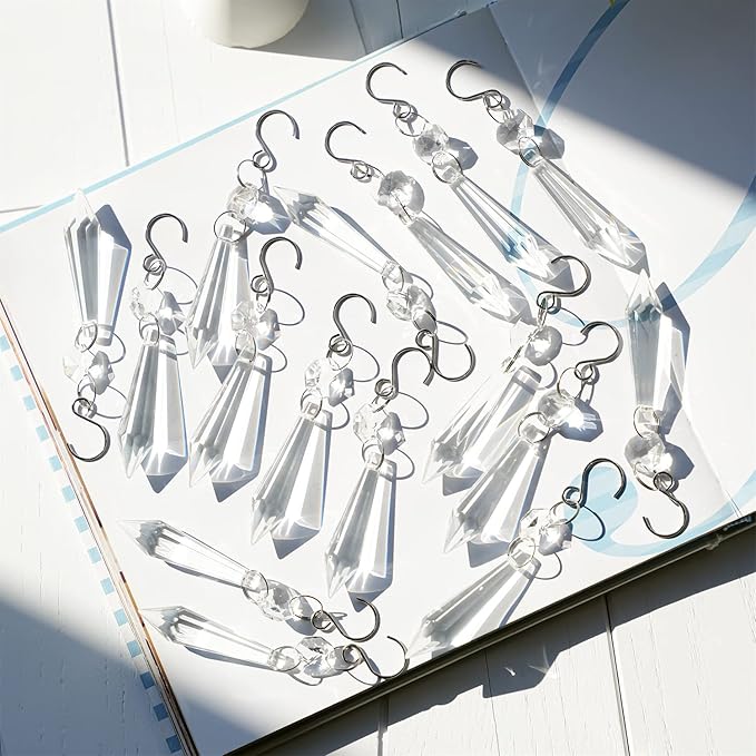 - What you get: 20 Pack 3.9″ Chandelier Icicle Crystals,Color: Clear.Each crystal glass icicle main chandelier prisms measures 55 mm / 2.2″ and includes 14 mm / 0.55″ top jewel octagon beads, and has a total hang of 3.9″/ 99 mm, connected with stainless jump rings to there is a hook make hanging simple